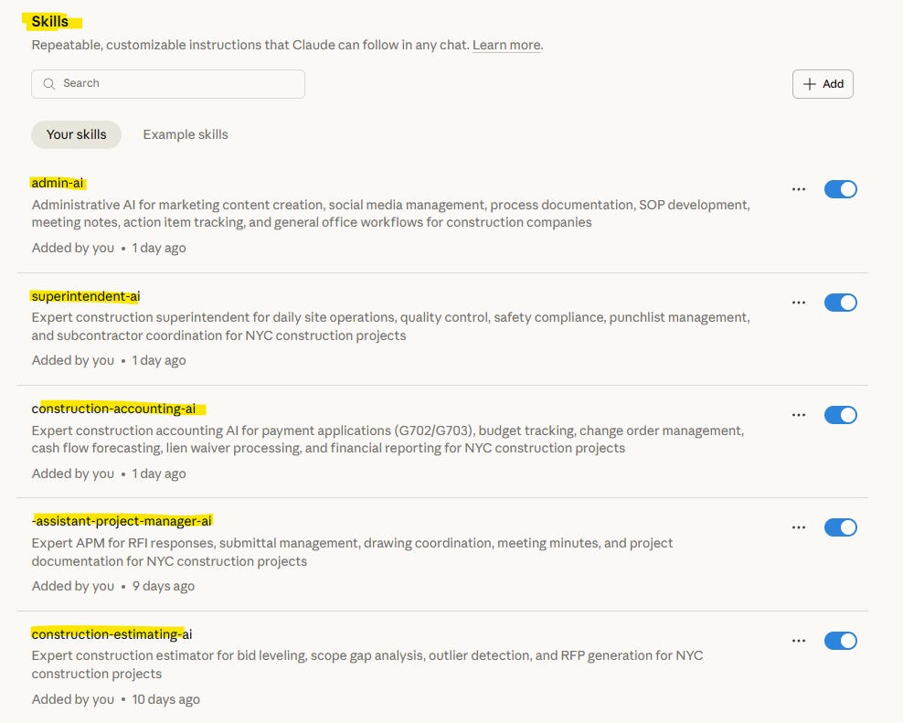 I built 5 specialized Claude AI Skills that work together as an integrated construction team. Not one general-purpose AI trying to do everything.