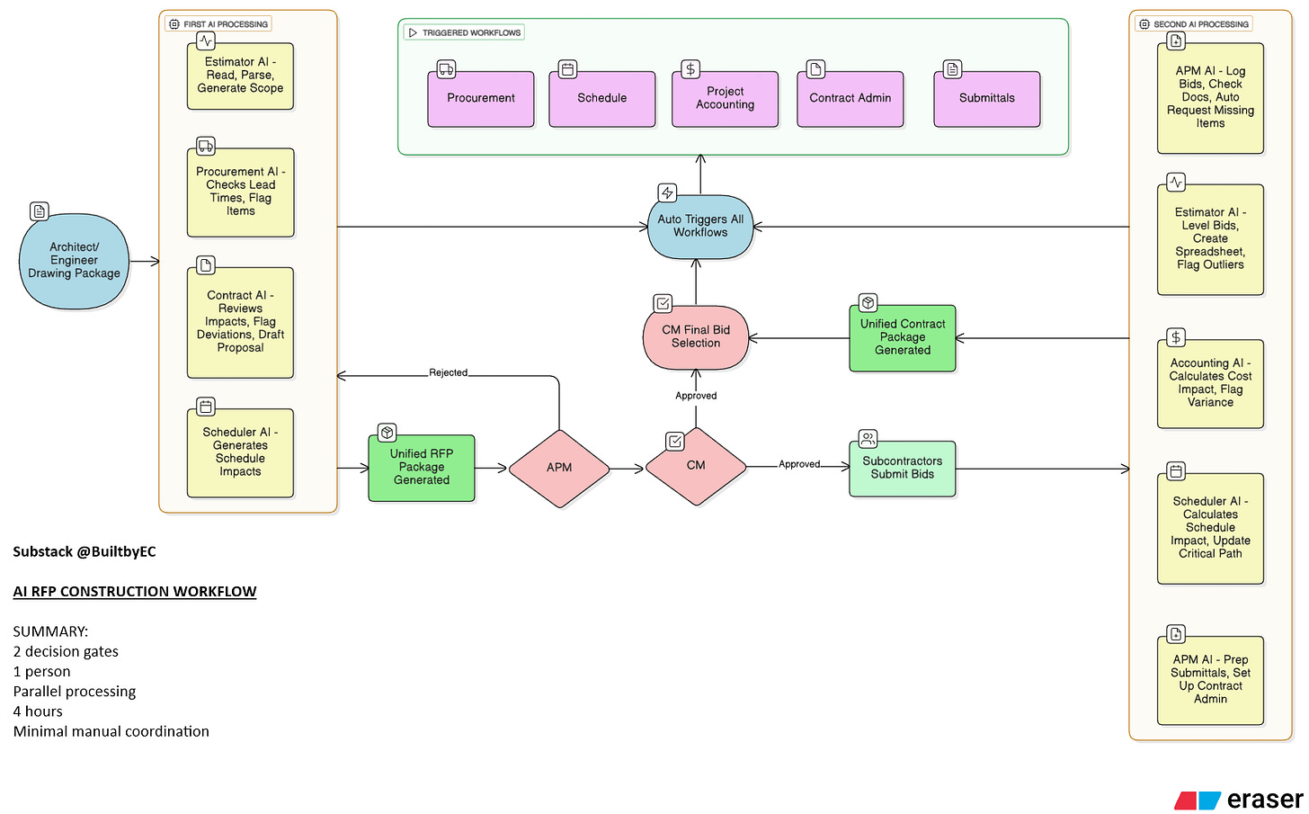 There are many issues with our traditional workflows in construction. Most glaring is the serial nature of decision making and the approval loops. I documented my plan for a new parallel AI workflow in my previous post with the following architecture: